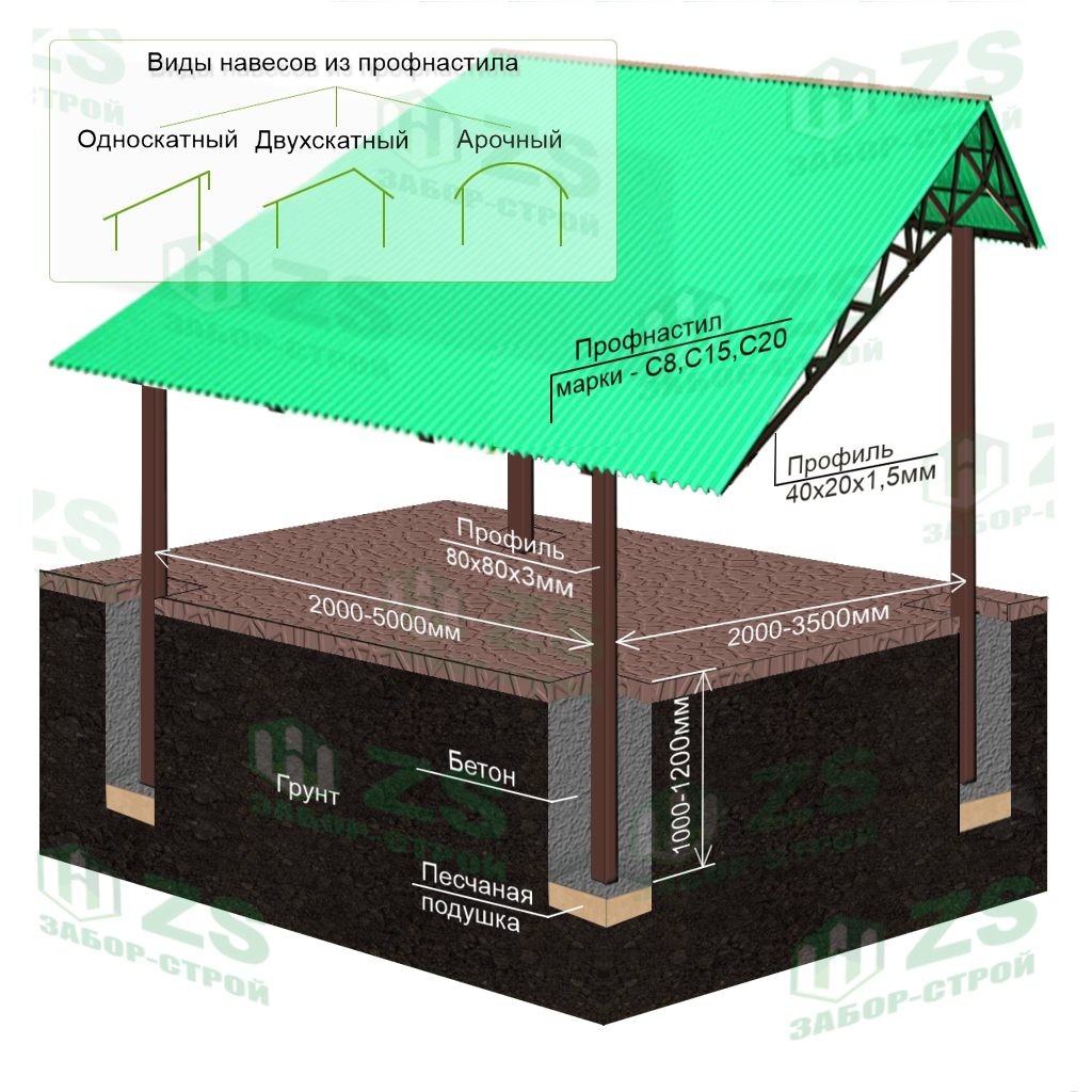 Стандартные характеристики каркаса навеса: столбы 80х80х3мм.