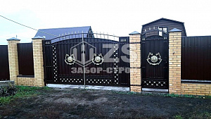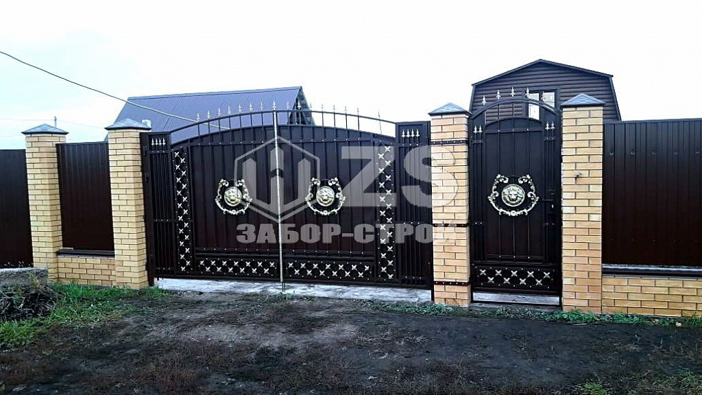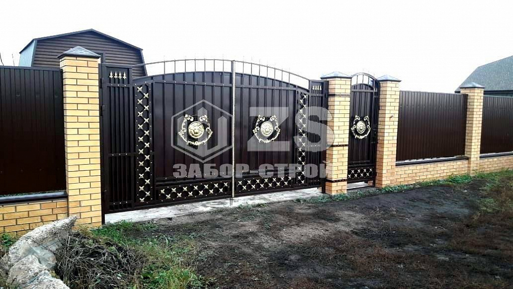 - Забор с кирпичными столбами из кованой секции 35 метров