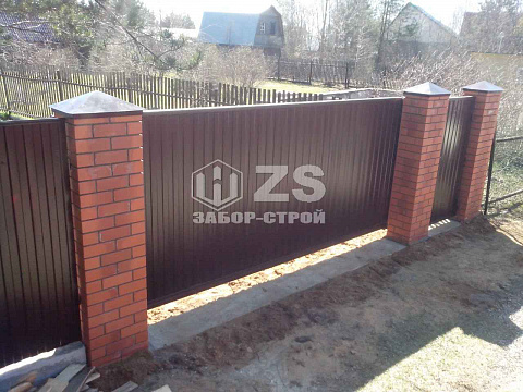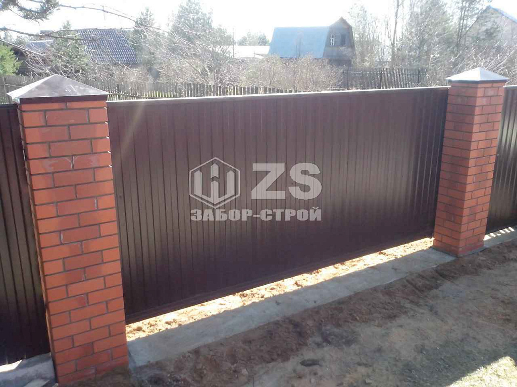 - Забор с кирпичными столбами из профнастила 20 метров