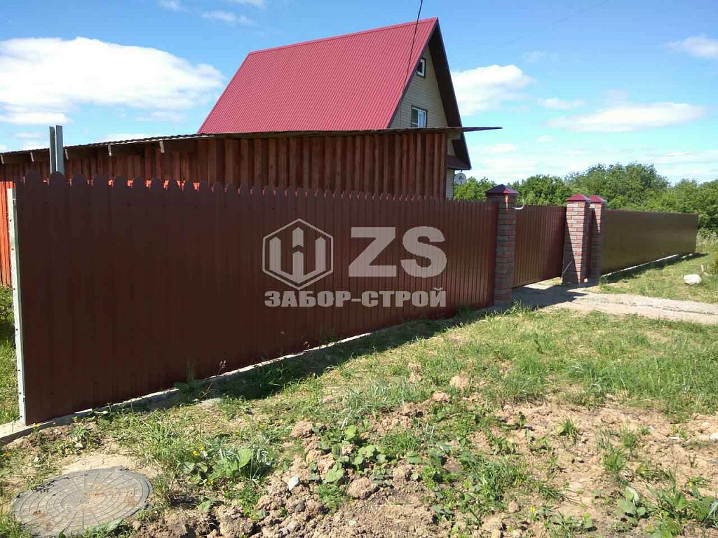 - Забор с кирпичными столбами из профнастила 25 метров
